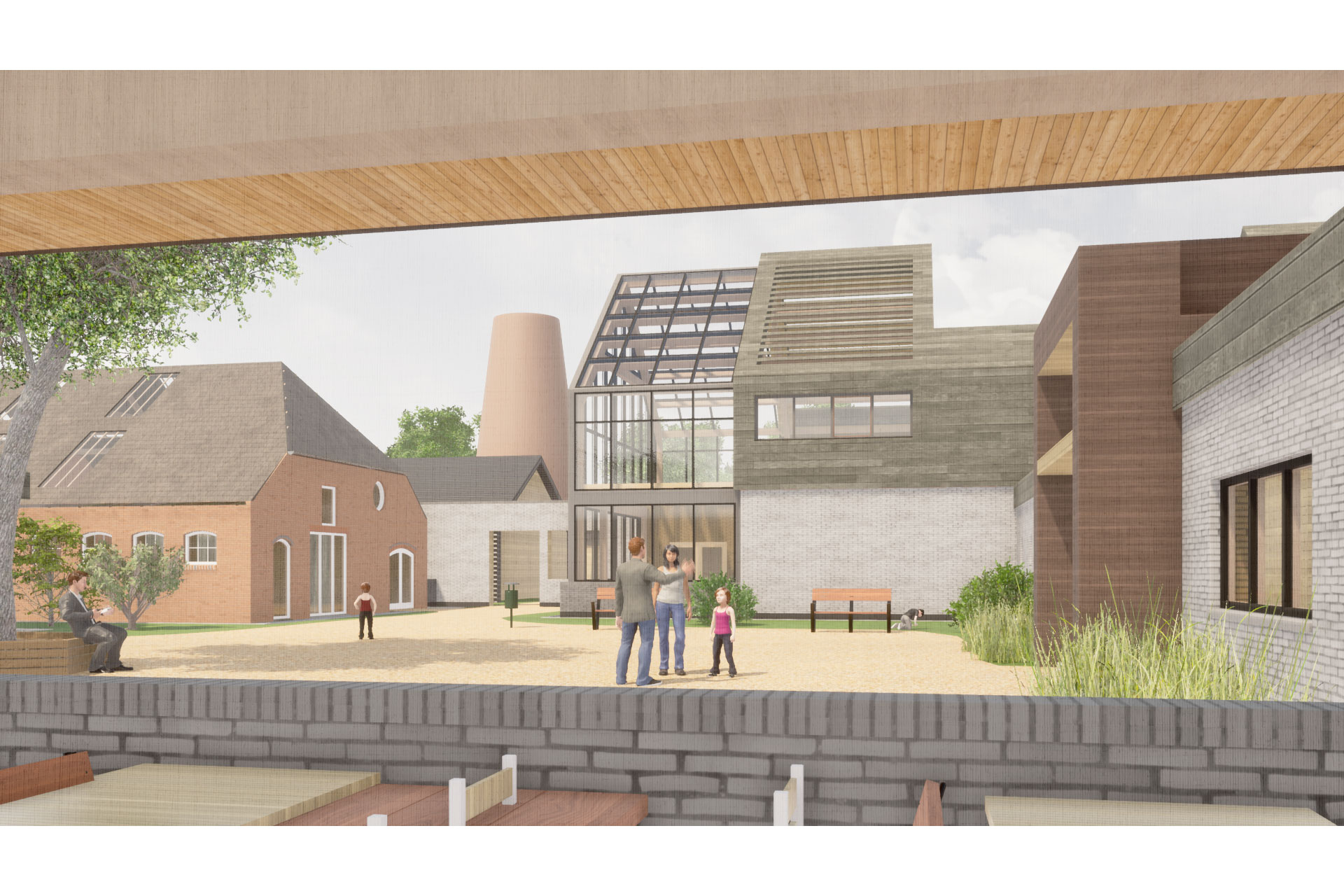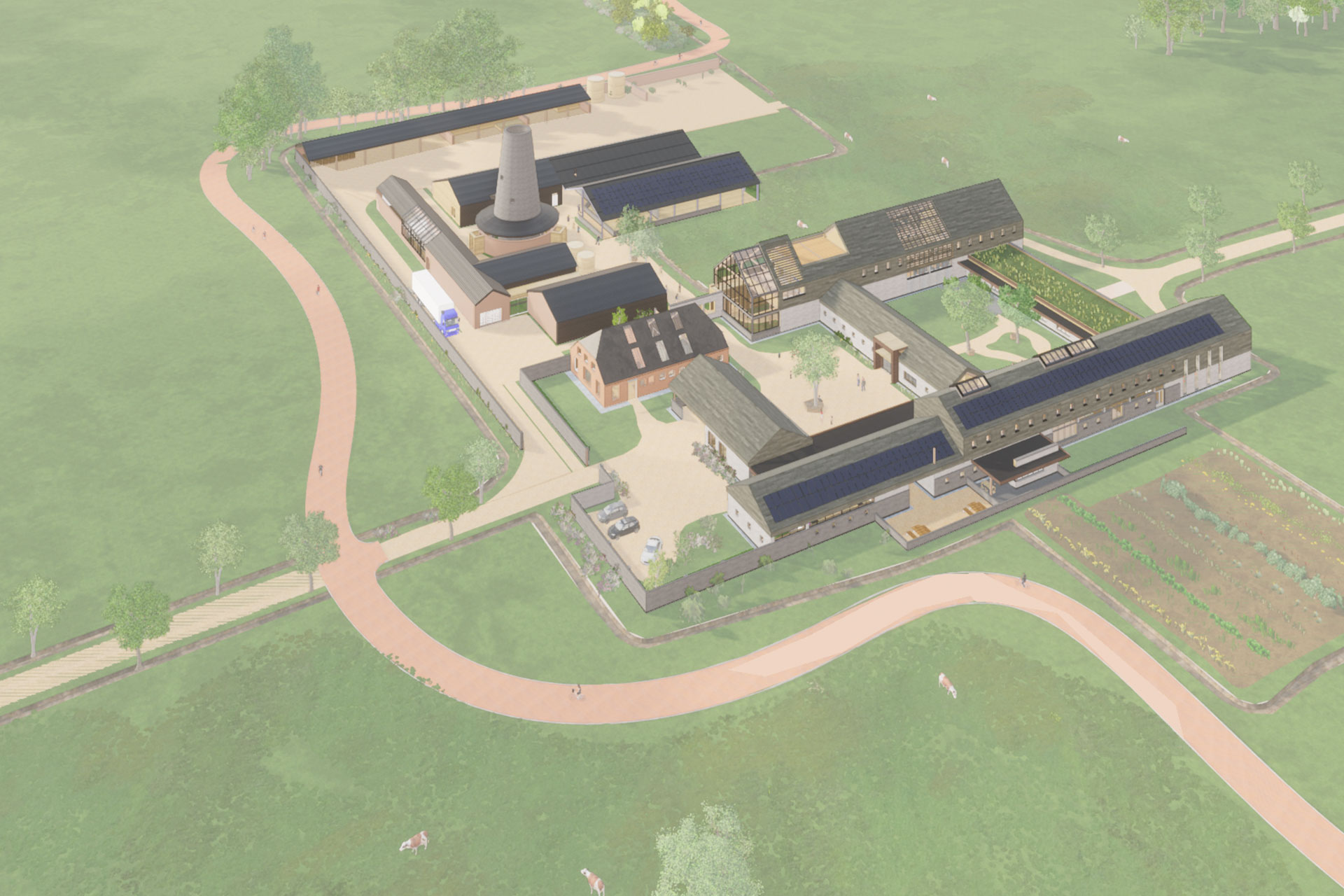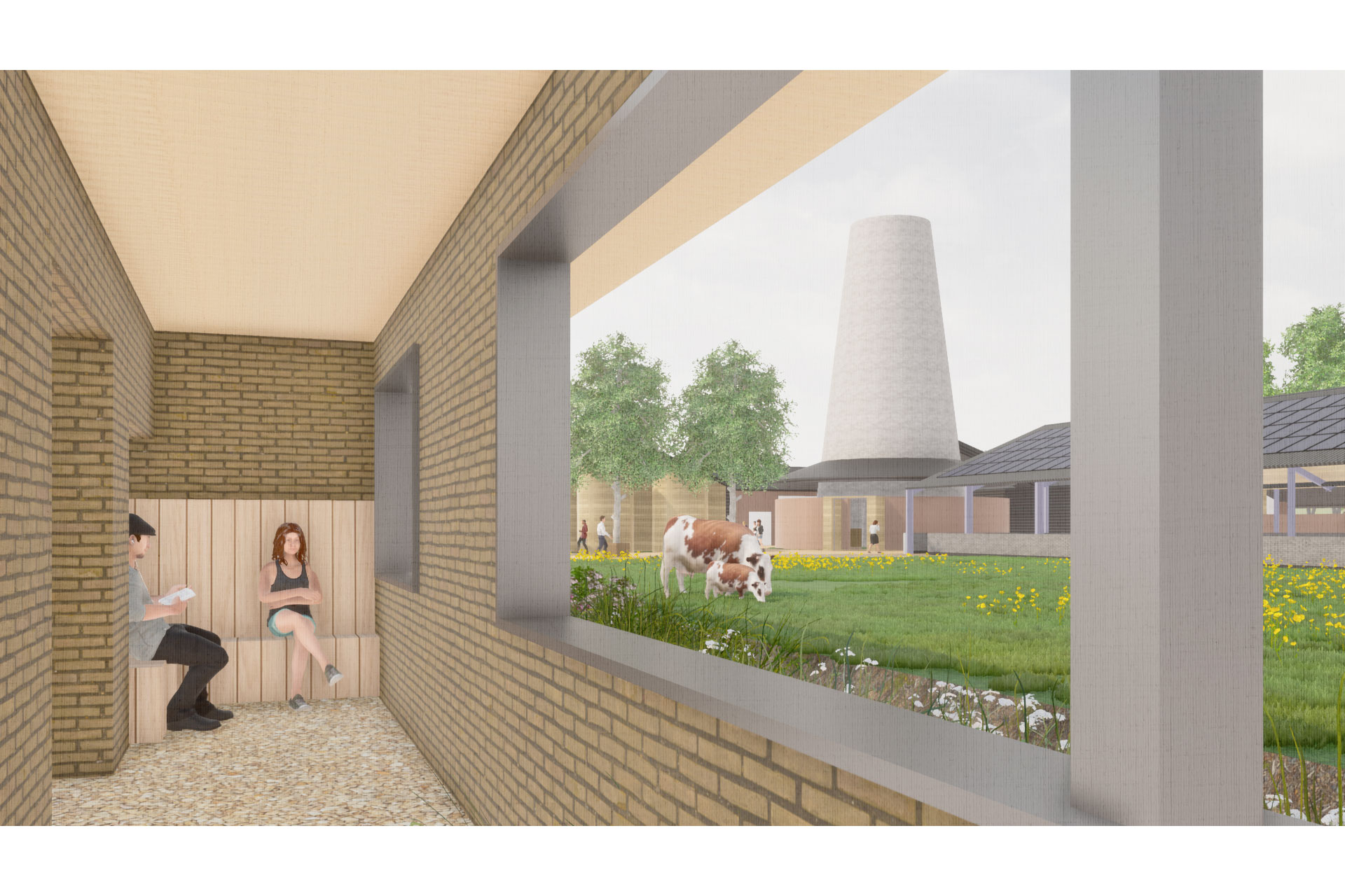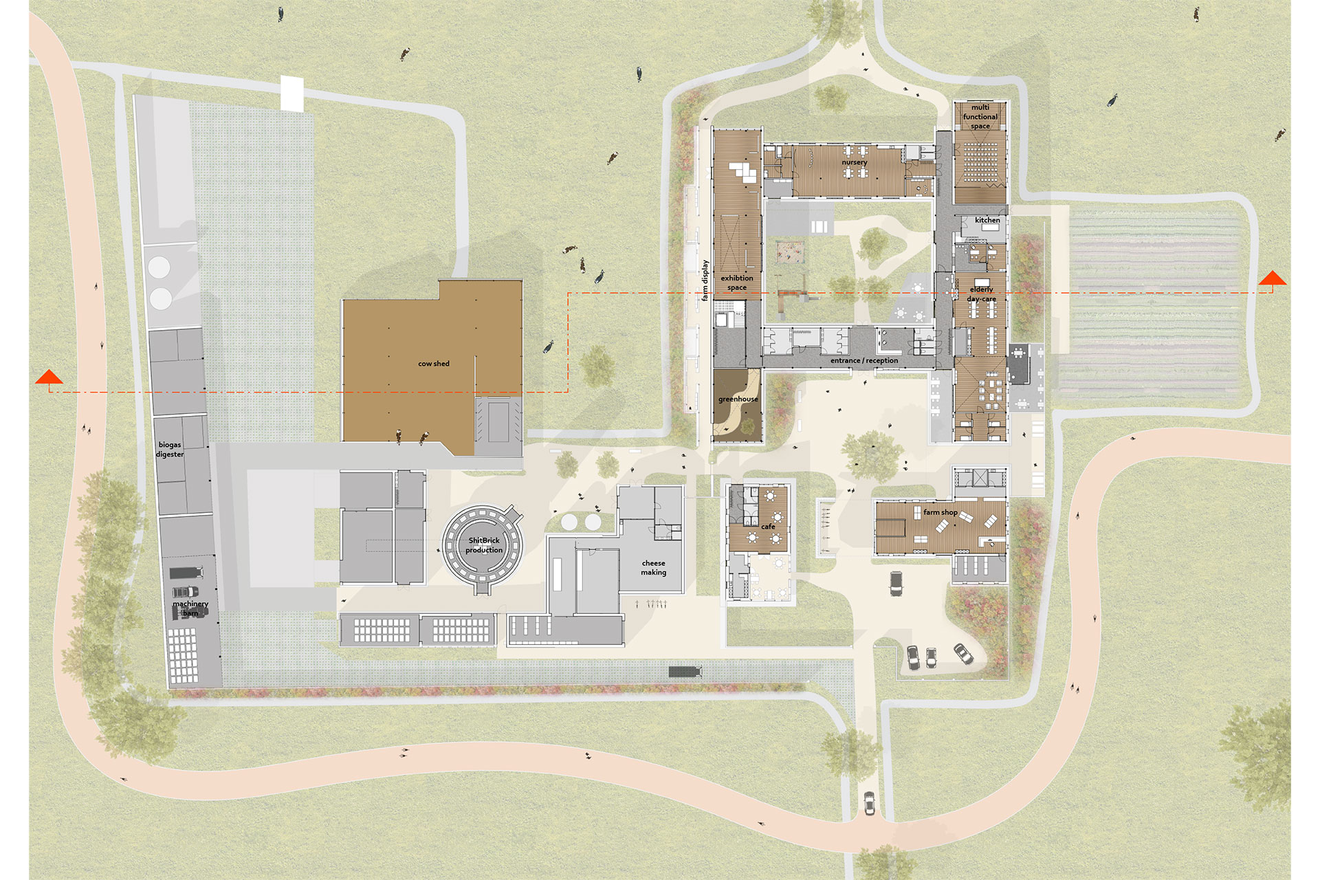 De herontwikkelde boerderij richt zich daarnaast op het opnieuw verbinden met de bevolking en de omringende natuur. Een openbare binnenplaats verbindt een boerderij winkel, café, tentoonstellingsruimte en een boerderijdisplay alsmede een route rond de boerderijfaciliteiten. Dagopvang voor zowel ouderen als kinderen is voorzien en verbonden met een semi-privé binnenplaats waar beide groepen elkaar kunnen ontmoeten. Al met is de herontwikkeling van dit melkveebedrijf een voorbeeld van hoe diversificatie, in plaats van de huidige landbouw industrialisatie, kan stimuleren en de band met het publiek en de natuur kan herstellen, terwijl de efficiëntie en het stimuleren van duurzame landbouw.