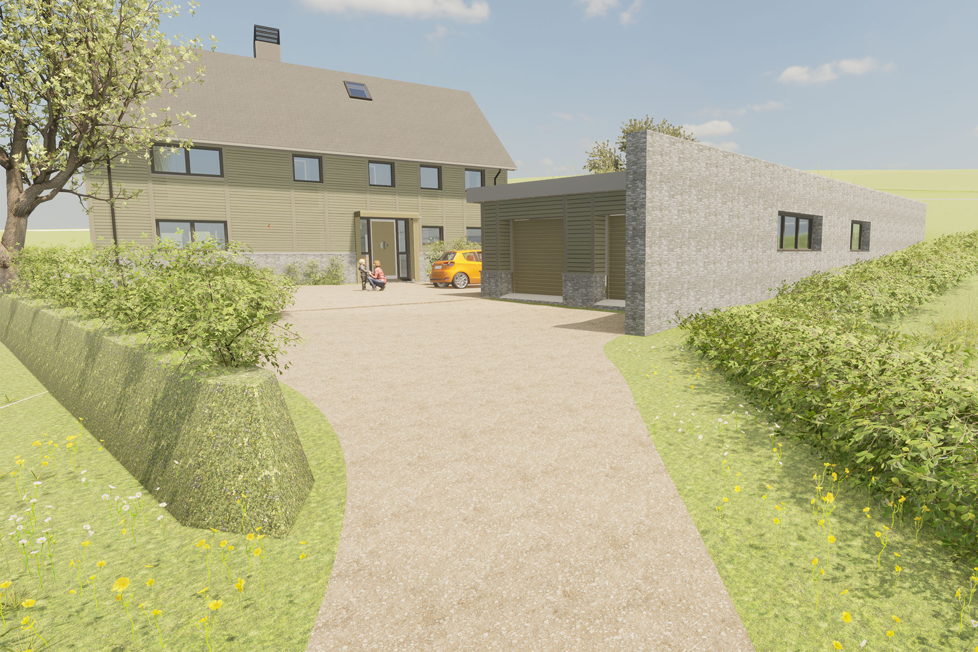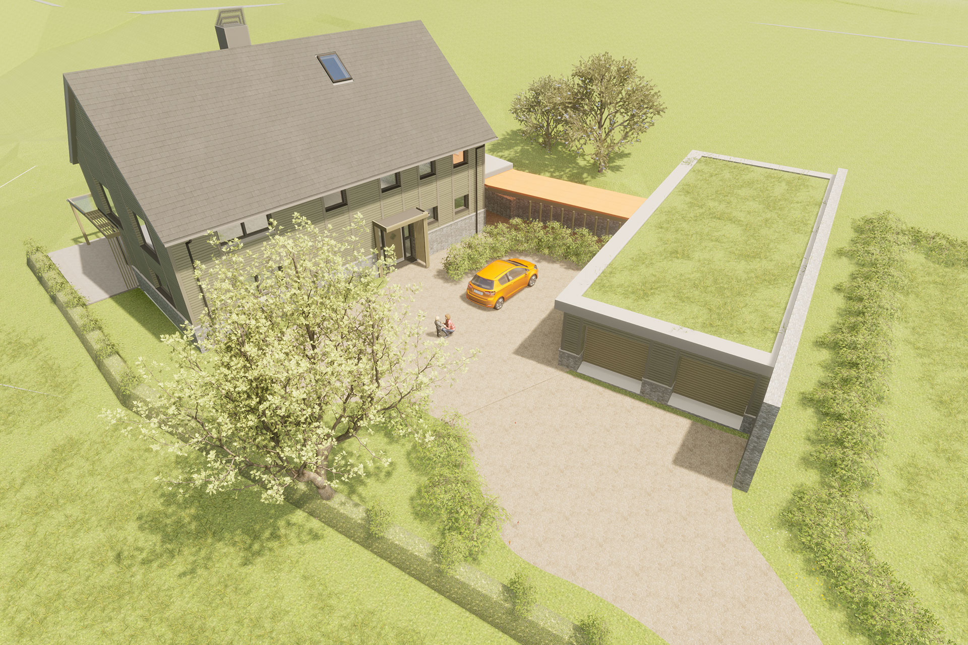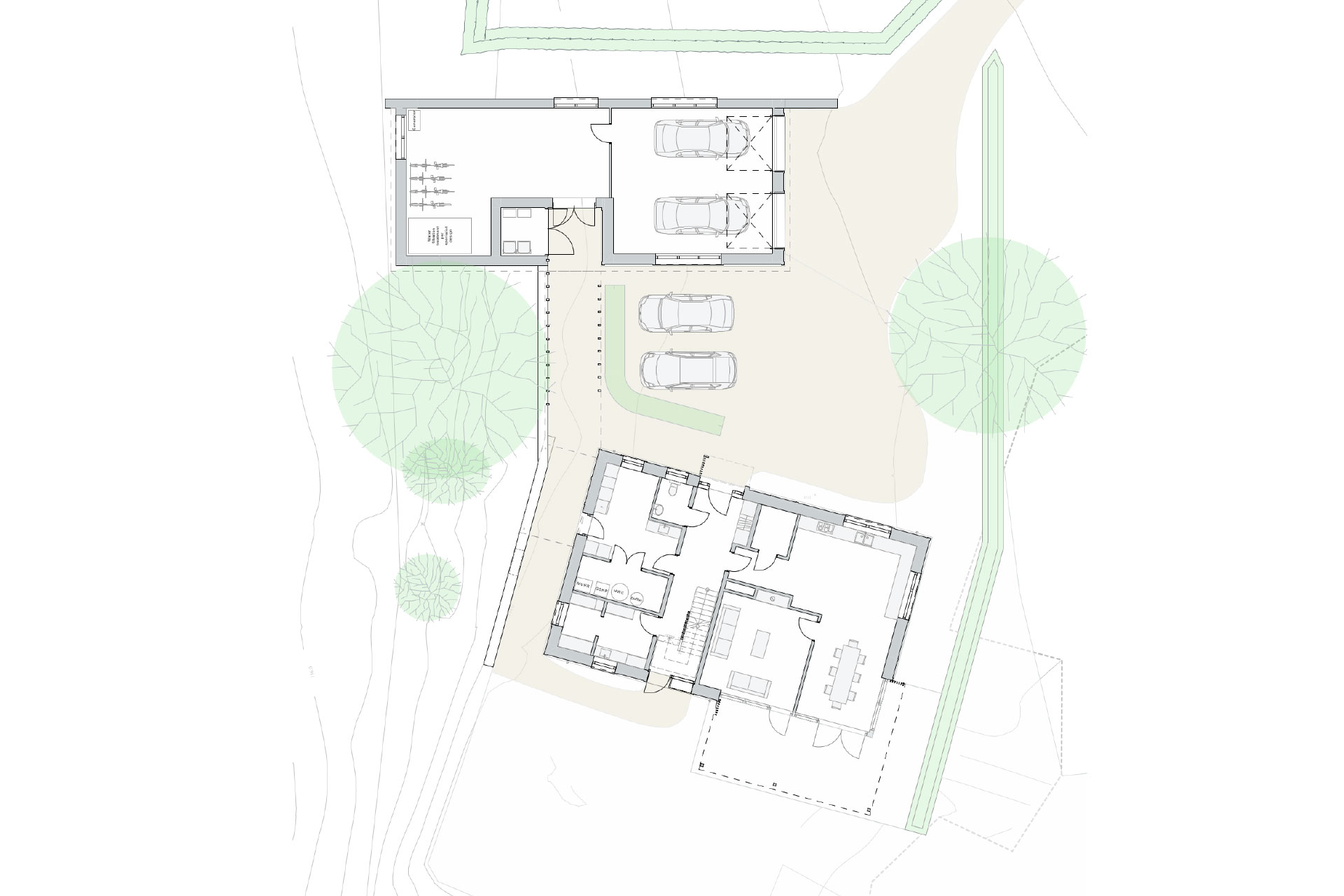 Het minimaliseren van de impact op de bestaande terreinomstandigheden is een aanvullend element dat prioriteit kreeg bij dit ontwerp. De oriëntatie en positionering van de schuurwoning en de garage/werkplaats zijn gebaseerd op het behoud van de bestaande grondniveaus en bomen waar mogelijk. Bovendien is de oriëntatie van het hoofdgebouw gericht op het vermijden van direct inkijk vanaf de openbare weg en het creëren van de ideale noord-zuid oriëntatie die een sterke basis vormt voor het voldoen aan de Passiefhuis-standaard. De schuurwoning is ontworpen op baisis van een I-stud houtskeletbouwsysteem waarbij een Fabric First aanpak wordt gehanteerd. Hoge isolatiewaarden worden bereikt door de I-studs te vullen met ingeblazen isolatiemateriaal en deze te bedekken met een doorlopende houtvezelplaatlaag. Bovendien is de gebouwschil luchtdicht uitgevoerd.