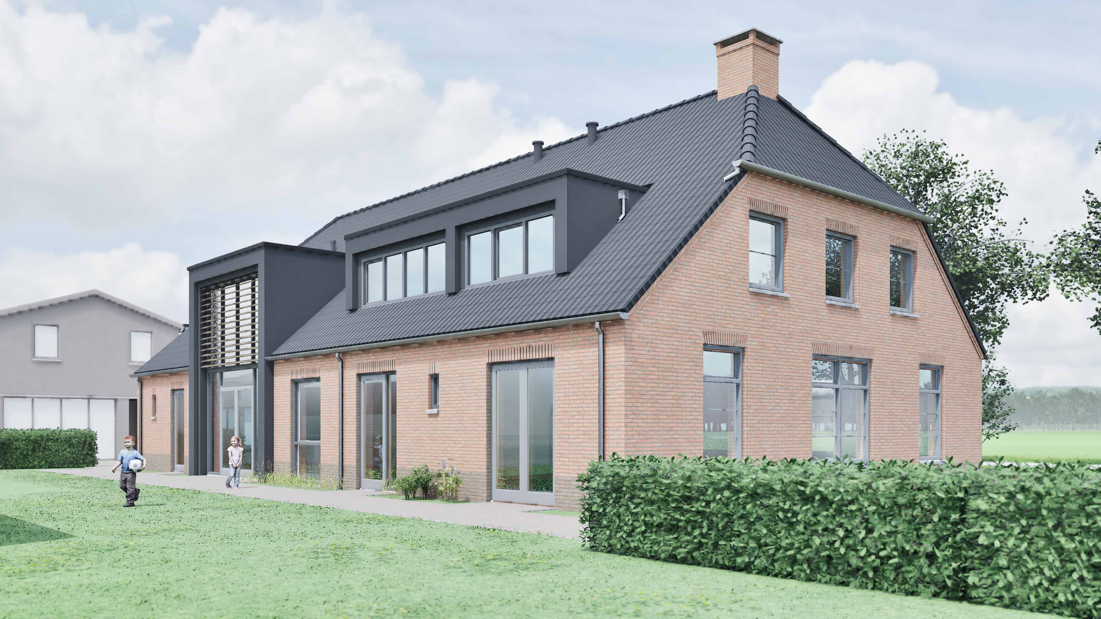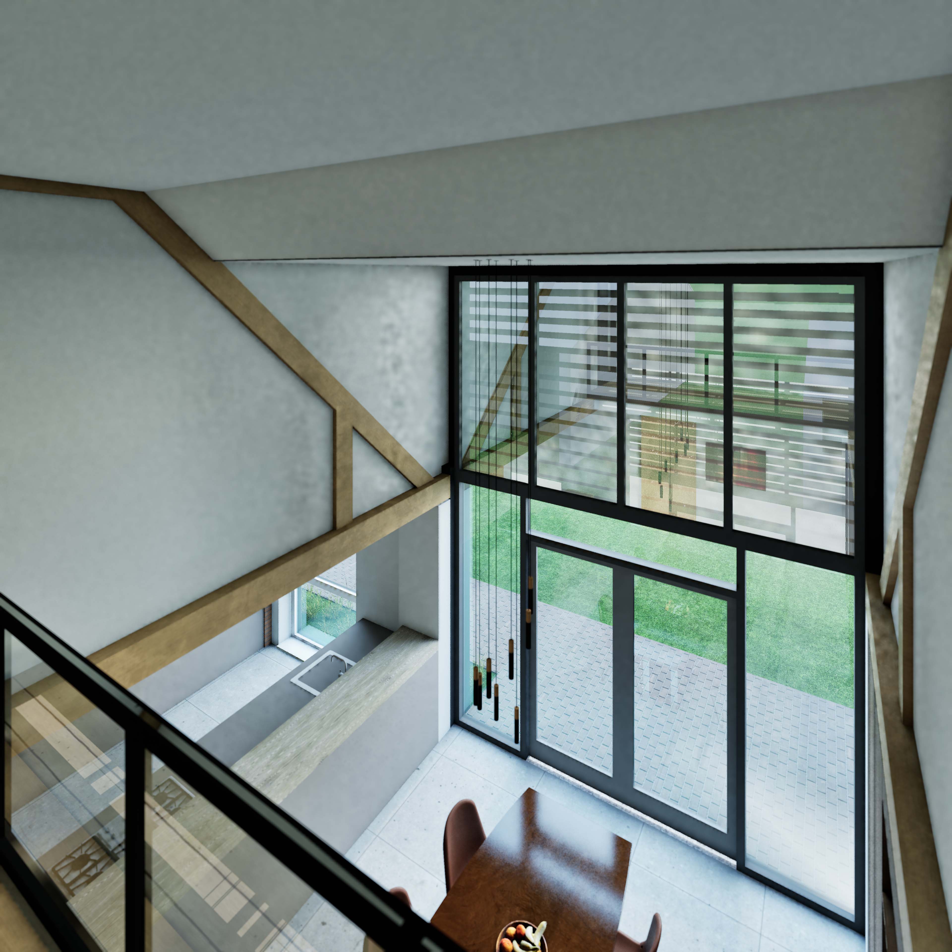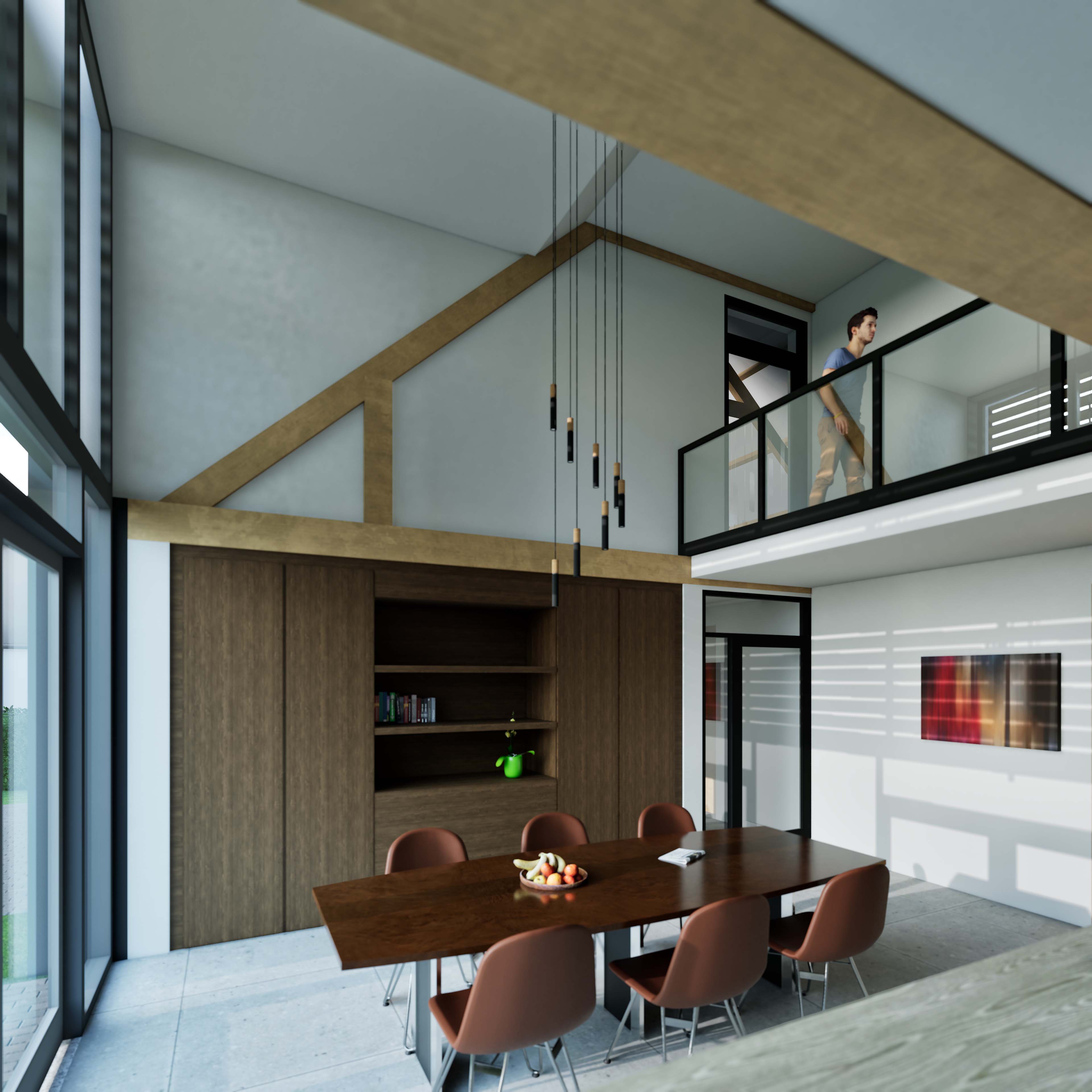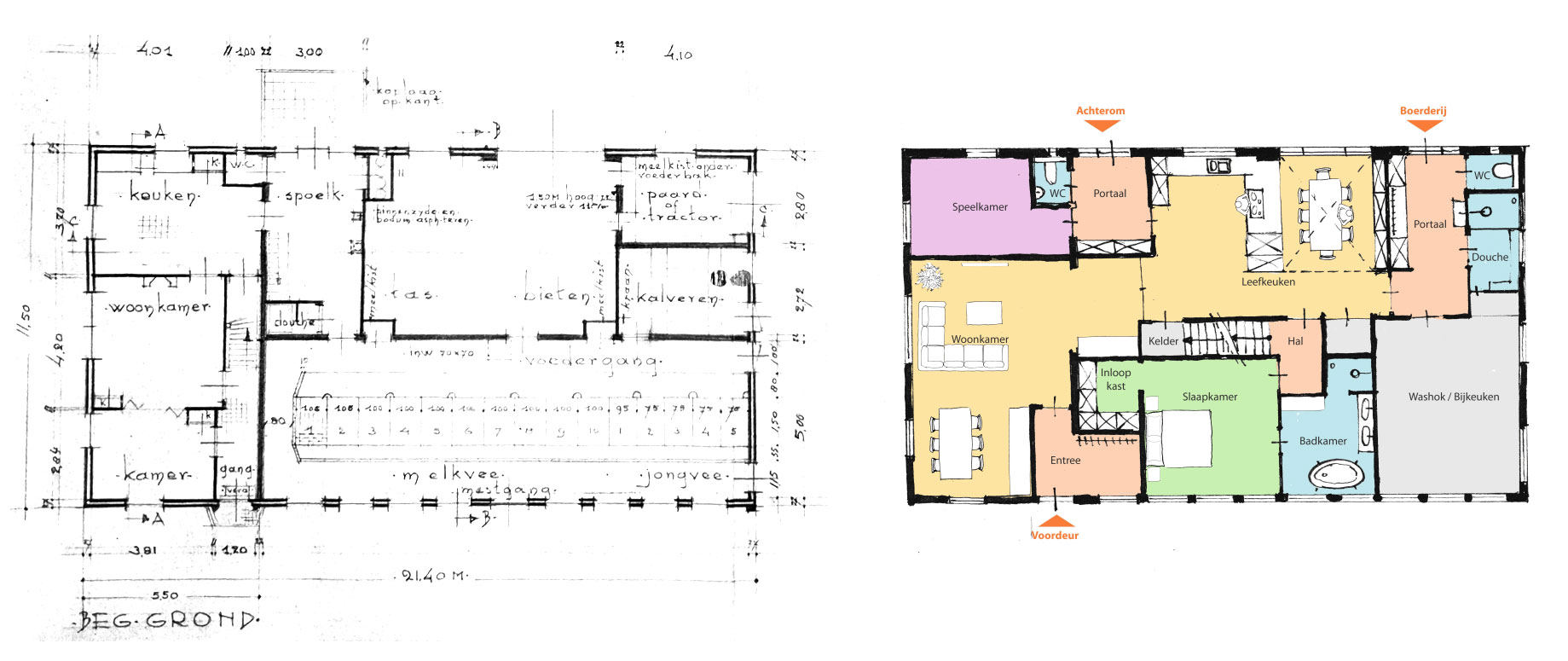 Deze langgevelboerderij uit de jaren ’50 is aangemerkt met cultuurhistorische waarde. Het behoud van het originele karakater en aanzichten was dan ook een vereiste in dit project. De baander die van origine diende als inrijdeur voor het binnenrijden van de oogst is met een moderne inslag in stand gebleven. Deze is nu door middel van een grote pui direct gekoppeld aan de nieuwe binnentuin en zorgt voor een vloed aan daglicht en ruimtelijkheid in de nieuwe ruime leefkeuken en vide ter plaatse van het voormalige stalgedeelte. De eiken spanten komen door de gehele boerderij terug en brengen het landelijke gevoel naar binnen.